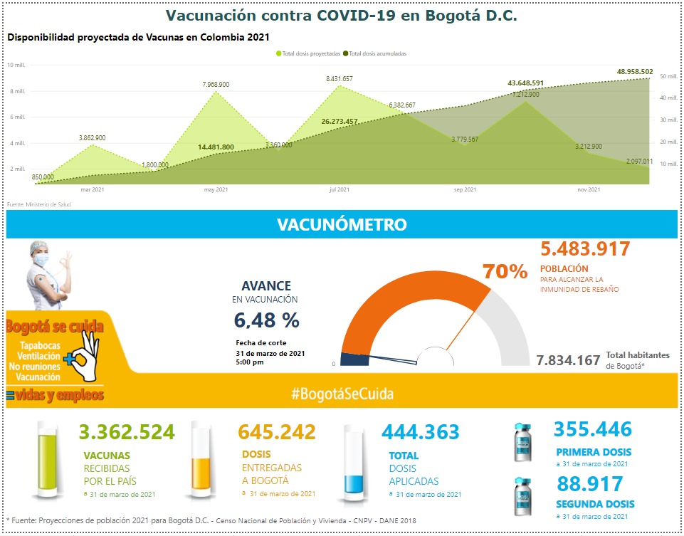 Este es el balance del proceso de vacunación contra el Covid-19 en Bogotá, con corte a las 5:00 p.m. del 31 de marzo de 2021.
