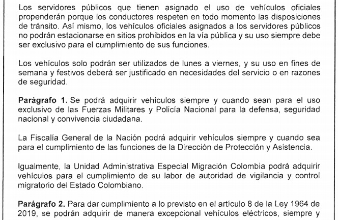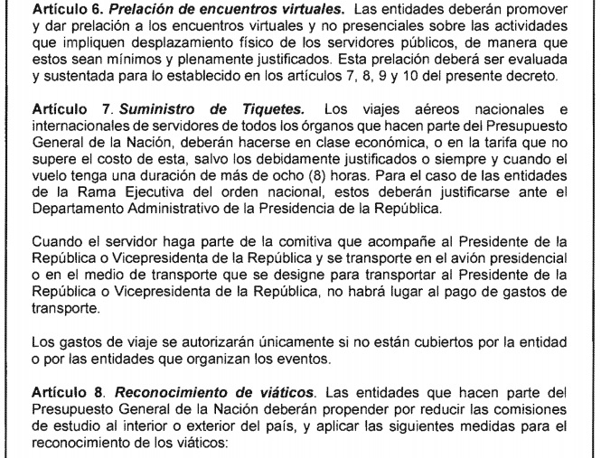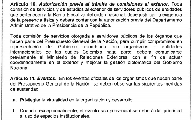 La norma contiene medidas de austeridad en materia de plantas y gastos de personal, contratación de prestación de servicios, horas extras y vacaciones, bienes inmuebles, prelación de encuentros virtuales, suministro de tiquetes y reconocimiento de viáticos.