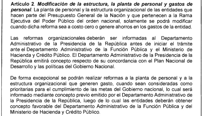 Según la normativa, la planta de personal de las entidades pertinentes solamente se podrá modificar cuando dicha reforma sea a costo cero o genere ahorros en los gastos de la entidad.
