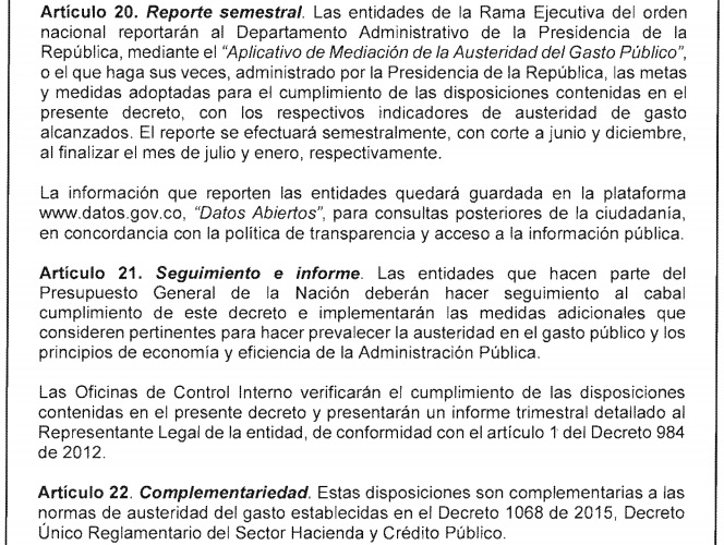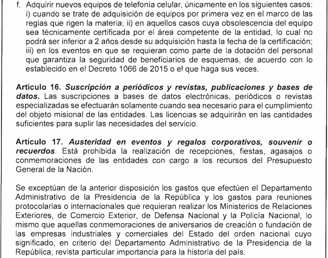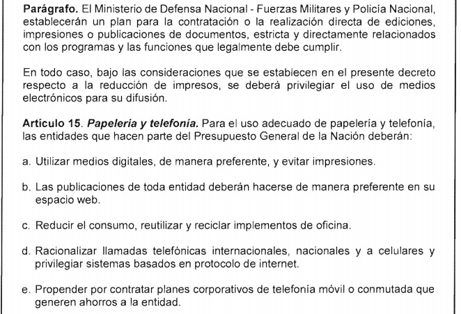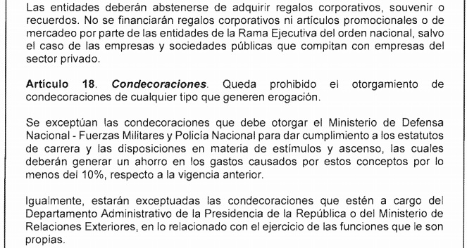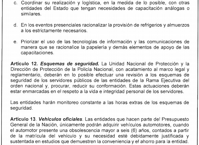 El Decreto también contiene medidas de austeridad en mantenimiento de inmuebles, cambio de sedes, control en delegaciones oficiales y comisiones al exterior, eventos públicos, papelería y telefonía, eventos y regalos corporativos, condecoraciones y sostenibilidad ambiental.