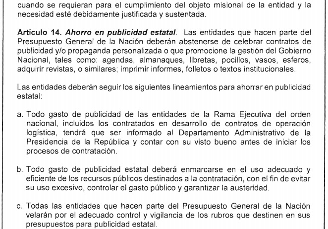 Las entidades deberán abstenerse de celebrar contratos de publicidad y propaganda personalizada o que promocione la gestión del Gobierno Nacional, tales como: agendas, almanaques, libretas, pocillos, vasos, esferos, adquirir revistas o similares e imprimir informes, folletos o textos institucionales.