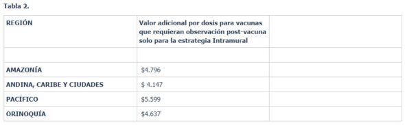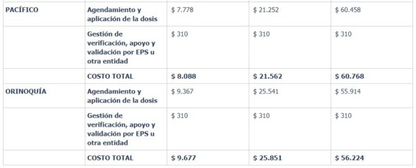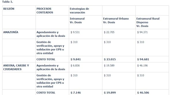 Sobre las tablas presentadas, el ministro explicó que se puede apreciar como las cifras varían de acuerdo con la región del país o con el proceso mismo si es intramural, extramural o extramural en rural disperso, «lo cual da unos valores diferenciales que buscan reconocer las diferencias que puede haber por el esfuerzo que hay que hacer por llevar vacunas a zonas apartadas o por tener que hacer, en algunos casos, observación prolongada, como es el caso de algunas vacunas».