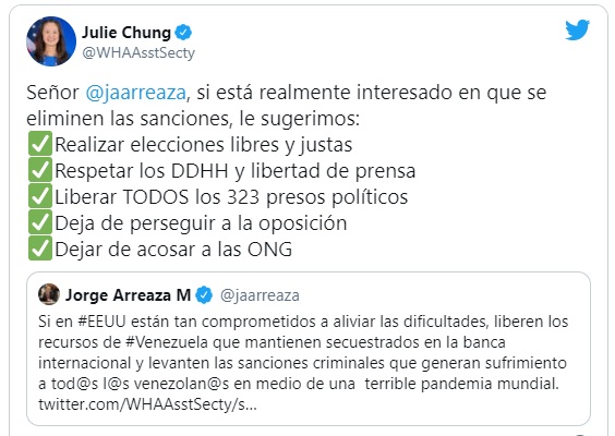 El mensaje de Chung mencionó al canciller de Maduro, Jorge Arreaza, quien dos días antes había publicado un mensaje dirigido a ella sobre los recursos presuntamente “secuestrados” por Estados Unidos al gobierno venezolano.