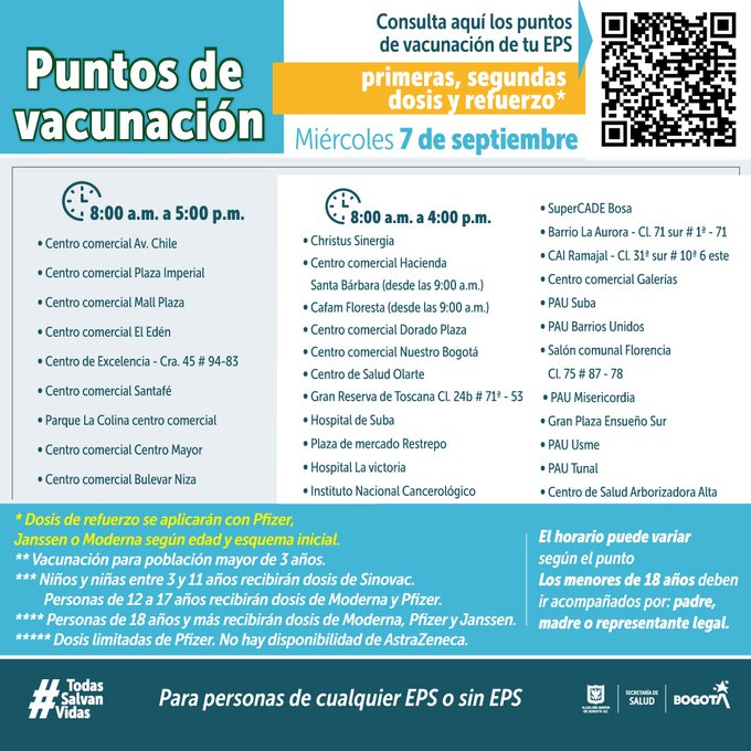 Desde las 9:00 a.m. de este miércoles 7 de septiembre, estarán habilitados más de 20 puntos en Bogotá de la Secretaría de Salud para que la ciudadanía complete su esquema de vacunación o reciba las dosis de refuerzo y protección contra el COVID-19.