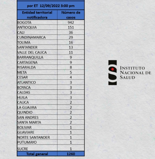 –En Colombia siguieron en aumento los contagios de la viruela símica o del mono, de acuerdo con el último reporte del Instituto Nacional de Salud, INS, con corte a este lunes 12 de septiembre. Se totalizan ya 1 mil 260 personas y son los hombres los más afectados; suman 1.250, mientras las mujeres son apenas 10.