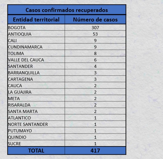 Bogotá, la capital colombiana, es la que tiene más personas contagiadas, con 942, seguida de Antioquia, con 151.