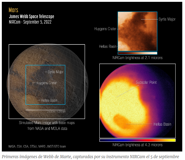 Estas observaciones NIRCam y NIRSpec de Marte se realizaron como parte del programa del sistema solar de Observación de Tiempo Garantizado (GTO) del Ciclo 1 de Webb dirigido por Heidi Hammel de AURA. (Información Margaret Carruthers, Instituto de Ciencias del Telescopio Espacial- NASA).