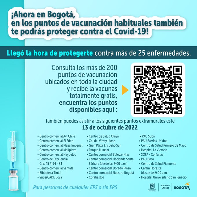 La Secretaría de Salud invita a la población en Bogotá a acercarse, con su documento de identidad, a los siguientes puntos de vacunación contra COVID-19 habilitados en Bogotá para iniciar, completar su esquema o recibir la dosis de refuerzo.