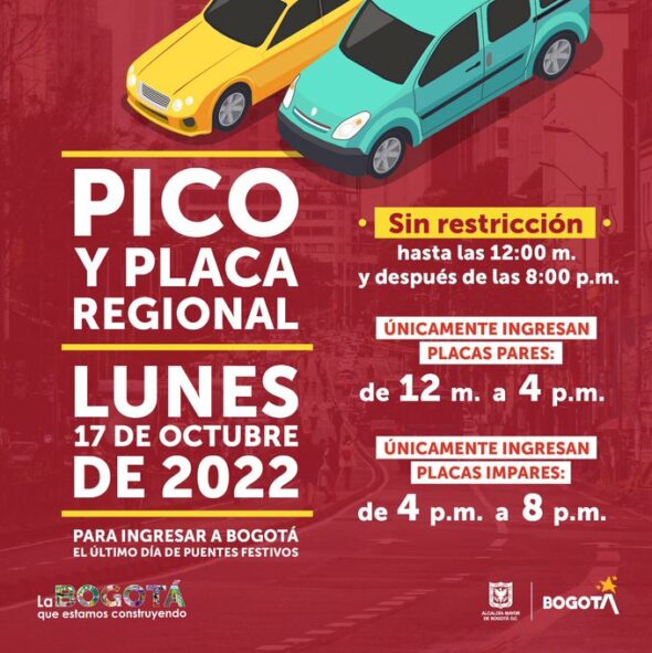 La alcaldesa encargada recordó que el lunes festivo 17 de octubre regirá la restricción de Pico y Placa Regional para entrar a Bogotá. Los vehículos pares podrán ingresar de 12 m. a 4 p.m. e impares de 4 p.m. a 8 p.m.