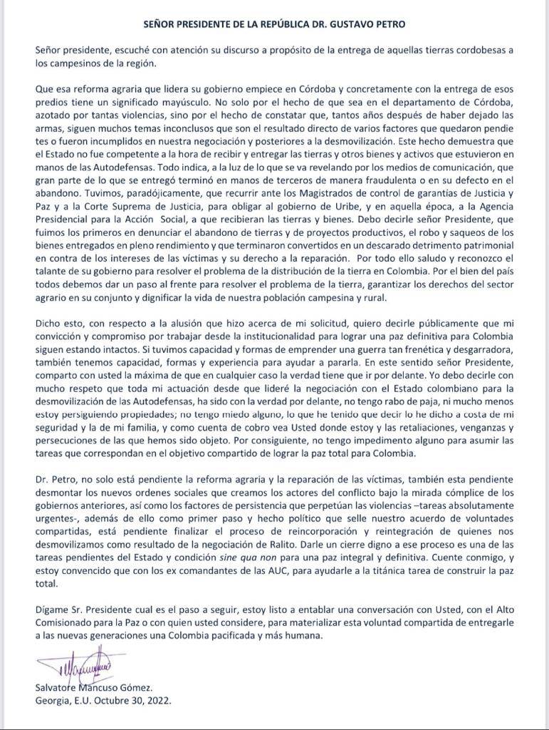 Por otro lado, el presidente Gustavo Petro divulgó en su cuenta en Twitter una carta que le envió el excabecilla paramilitar Salvatore Mancuso, en la cual afirma que está listo a entablar dialogo con el primer mandatario o con quien designe, «para materializar esta voluntad compartida de entregarle a las nuevas generaciones una Colombia pacífica y humana».