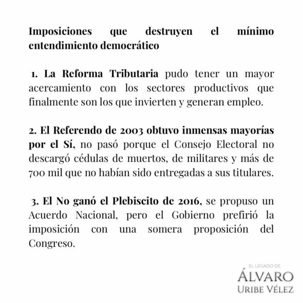 –Como una de «las imposiciones que destruyen el mínimo entendimiento democrático», calificó el expresidente y exsenador Alvaro Uribe Vélez, la Reforma Tributaria, aprobada en conciliación por la plenaria del Senado de la República.