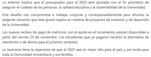 –Luego de reevaluar las implicaciones de la coyuntura económica del país, y teniendo en cuenta los análisis económicos del Ministerio de Educación, las universidades Javeriana y Los Andes, decidieron reducir del 12,8 a 12,2 por ciento el aumento de las matrículas para el próximo año, esto es, acorde con el aumento del Índice de Precios al Consumidor, IPC.