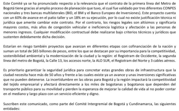 Comité Intergreamial de Bogotá y Cundinamarca pide al Gobierno Nacional no condicionar obras del Metro