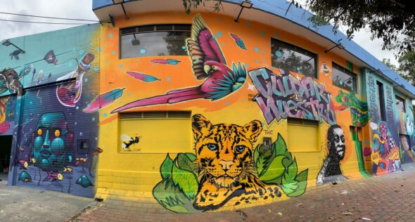 Guacamayas, tiburones, medusas, garzas, tortugas y jaguares, se mezclan con exuberantes imágenes de la flora colombiana en diversos colores en un gran mural que se tomó las paredes de la Corporación Educativa Indoamericana.