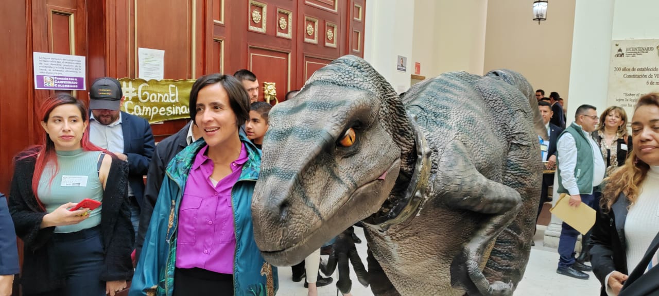 No al fracking en Colombia, mensaje de la Ministra de Ambiente y el dinosaurio Frankie al interrumpir Plenaria en el Congreso