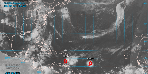 –El Centro Nacional de Huracanes de los Estados Unidos emitió este viernes alertas sobre la tormenta tropical Bret, ubicada sobre el este del Mar Caribe cerca de Windward islas, y la tormenta tropical Cindy recientemente mejorada, ubicada sobre el Atlántico…