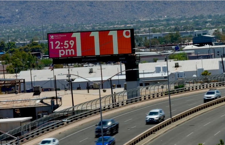 –(Foto AP). Un letrero lumínico en una carretera de Phoenix, Arizona, marca una alta temperatura de 111 grados Fahrenheit (43,8 Celsius). Pero no es la única región que en EE.UU soporta temperaturas peligrosamente elevadas y, adicionalmente, una contaminación severa del aire debido a incendios forestales en Canadá.