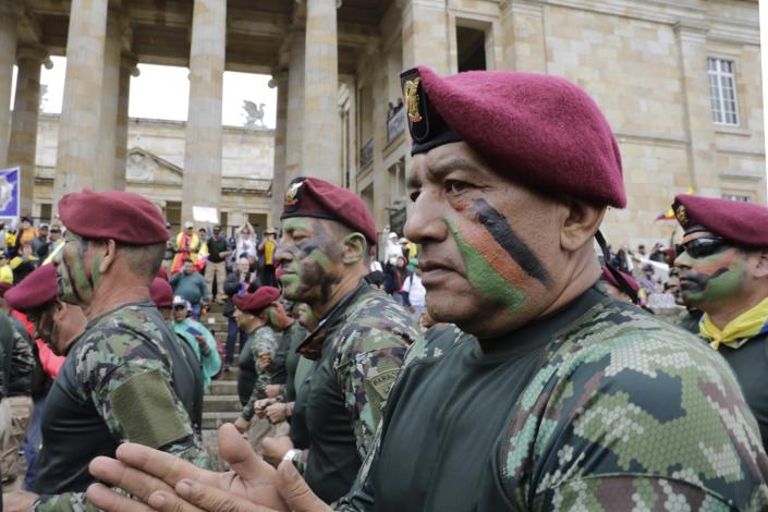 Con proclamas como «Fuera Petro», los exmilitares y expolicías, algunos de ellos vistiendo el uniforme de camuflaje, recitaron la «Oración Patria» en esta manifestación que se llevó a cabo en vísperas del Día de la Independencia en el que, según han dicho, los reservistas y veteranos no participarán en el tradicional desfile militar por no estar de acuerdo con las políticas del Gobierno.