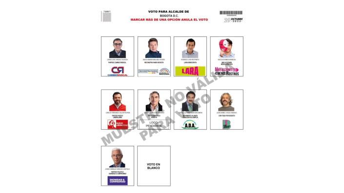 El 18 de agosto, la Registraduría sorteó la ubicación de los logos y candidatos para los tarjetones, entre ellos, el de la Alcaldía de Bogotá, que cuenta con nueve candidatos y la opción del voto en blanco.