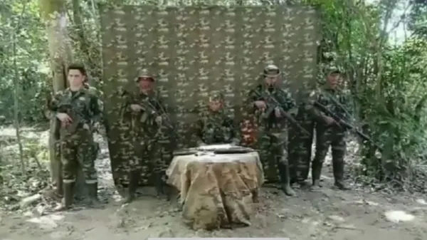 –(Foto: captura de video). El Comando de la Décima Tercera Brigada, unidad orgánica de la Quinta División del Ejército Nacional, anunció que inició las acciones de verificación sobre la existencia de un grupo armado disidente de las Farc en Cundinamarca, el cual se presentó a través de un video que circula en redes sociales y que se autodenomina compañía Misael Rodríguez. Advirtió que hasta el momento no se tiene identificado.