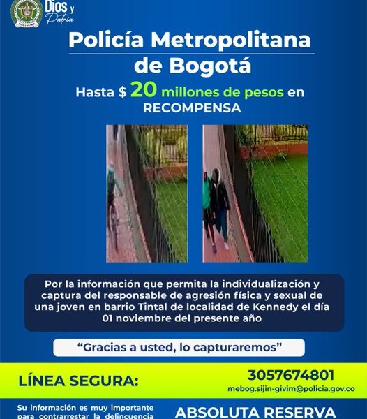–La Policía Metropolitana de Bogotá ofreció una recompensa de hasta 20 millones de pesos por información que conduzca a la captura del hombre que agredió física y sexualmente a una joven en el barrio El Tintal de Kennedy, el pasado primero de noviembre.