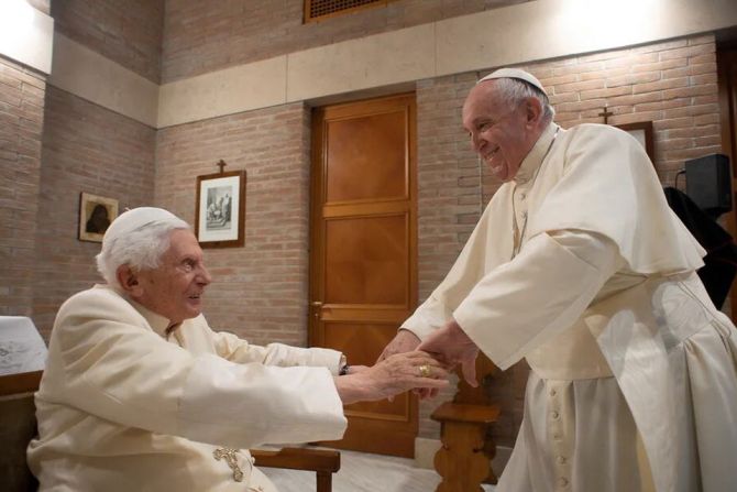 El Papa recordó también las circunstancias de su adiós a Benedicto el miércoles 28 de diciembre de 2022, cuando le vio con vida por última vez: «Benedicto estaba acostado en la cama. Seguía consciente, pero no conseguía hablar. Me miraba, me apretaba la mano, entendía lo que yo le decía, pero no lograba articular palabra. Estuve un rato con él así, lo miraba y le tomaba la mano. Recuerdo perfectamente sus ojos claros… Le dije unas palabras con cariño y lo bendije. De esta forma, nos despedimos».