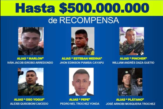 El jefe de la cartera de Defensa anunció una recompensa de hasta 500 millones de pesos por información que ayude con la ubicación o captura de integrantes de los cabecillas del llamado frente ‘Jaime Martínez’ del estado mayor central alias ‘Marlón’, ‘Esteban Medina’, ‘Pincher’, ‘Oso Yogui’, ‘Pepe’, ‘Plátano’.
