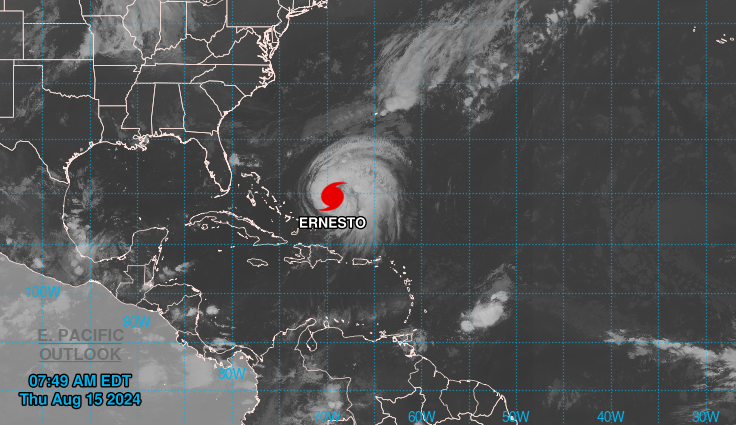 –(Foto Centro Nacional de Huracanes de EE.UU). El huracán Ernesto pasó al norte de Puerto Rico dejando aguaceros, inundaciones y cortes de electricidad, como así también en otras islas del Caribe que aún se preparan para lo peor. El meteoro avanza en mar abierto con vientos máximos de hasta 130 kilómetros por hora.