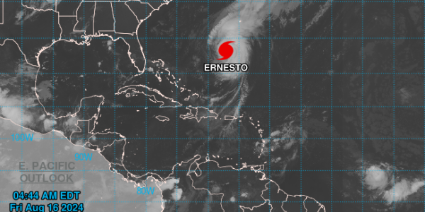 –(Foto Centro Nacional de Huracanes EE.UU). El huracán Ernesto se fortaleció hasta convertirse en un ciclón de categoría 2 el jueves por la noche, mientras se dirigía hacia Bermuda después de dejar a miles de personas sin electricidad ni agua…