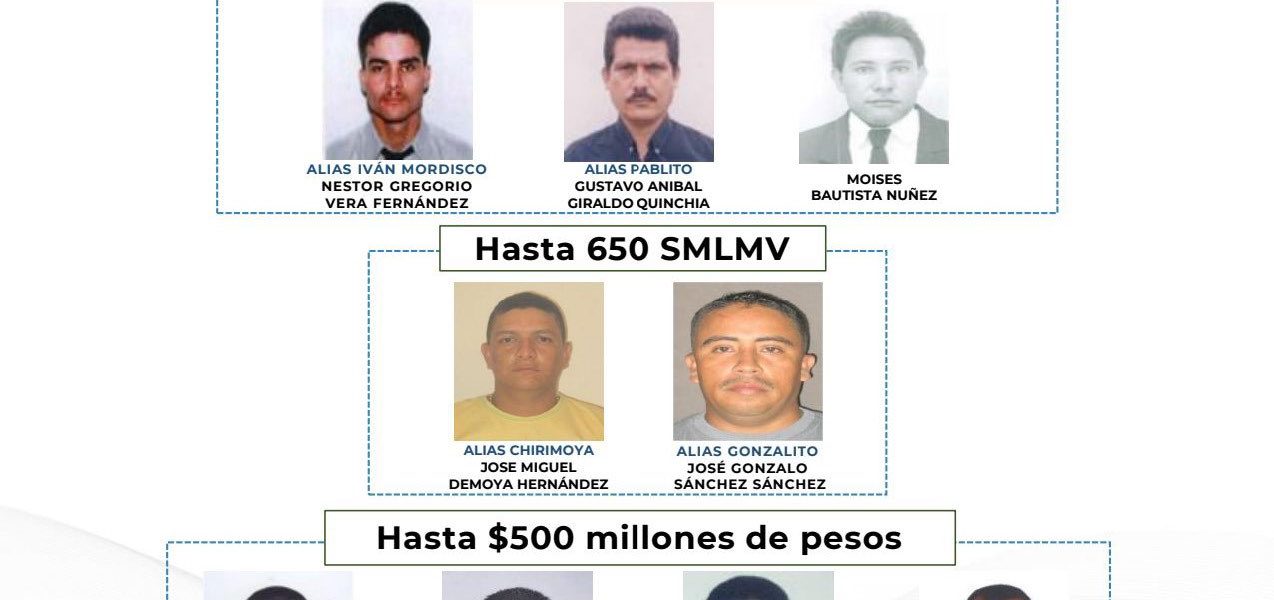 –Con el cartel de los más buscados y recompensas de más de $3.000 millones, Gobierno Nacional puso en marcha la Operación Themis 2.0 para ubicar y capturar a 78 jefes de las bandas criminales. Encabezan el cartel Néstor Gregorio Vera, alias ‘Iván Mordisco’, del llamado estado mayor central de las disidencias de la Farc; Gustavo Aníbal Giraldo, alias ‘Pablito’, del frente de guerra oriental del Eln; José Gonzalo Sánchez, alias ‘Gonzalito’, segundo al mando del clan del golfo.