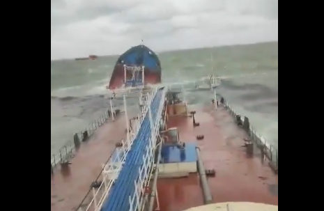 –(Foto captura de video red social). Debido a una fuerte tormenta, dos gigantes buques cisterna repletos de fueloil, se hundieron en el Mar Negro ubicado entre Asia occidental y Europa oriental, rodeado por Turquía, Georgia, Bulgaria, Rumanía, Ucrania y Rusia. Uno de los buques se partió por la mitad. La proa resultó arrancada y la tripulación se vio obligada a resguardarse en la popa. Se precisa que el siniestro se produjo a unos 8 kilómetros de la costa.