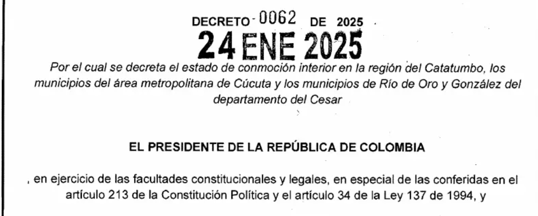 El Gobierno expidió el Decreto de Estado de Conmoción Interior en la región del Catatumbo, los municipios del área metropolitana de Cúcuta y los municipios de Río de Oro y González del departamento del Cesar.