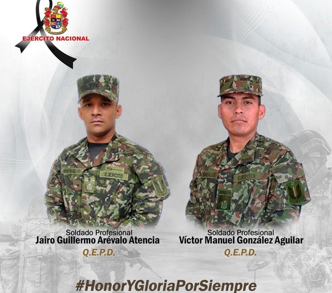 Lamento la pérdida de dos de nuestros valientes soldados, Jairo Guillermo Arévalo Atencia y Víctor Manuel González Aguilar, quienes entregaron su vida en cumplimiento del deber. Expreso también mi solidaridad con nuestros cuatro uniformados heridos, quienes reciben en estos… pic.twitter.com/KP2OXt6gMj