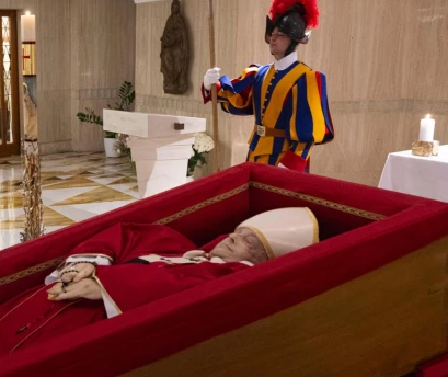 Luego de las oraciones, el cuerpo del papa, revestido con ornamentos litúrgicos rojos, la mitra y el palio, es colocado directamente en un ataúd sencillo de madera con un revestimiento de zinc, suprimiendo el uso del catafalco (la estructura elevada donde solían exponerse los papas). La vela pascual se coloca cerca y se enciende para la siguiente parte del rito, que incluye la aspersión con agua bendita. El féretro queda en un lugar adecuado dentro del Vaticano para la visita y oración de allegados, hasta que se traslade para la exposición pública.
