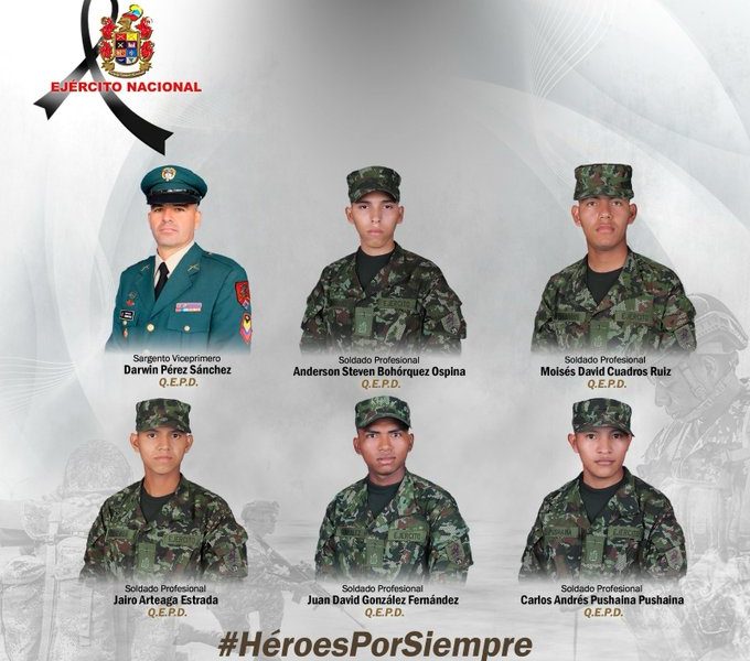Añade que al momento, se confirma el asesinato de seis de nuestros héroes, entre ellos el Sargento Viceprimero Darwin Pérez Sánchez y los soldados profesionales Jairo Arteaga Estrada, Anderson Steven Bohórquez Ospina, Juan David González Fernández, Carlos Andrés Pushaina Pushaina y Moisés David Cuadros Ruiz. Además, cinco de nuestros hombres que habían sido secuestrados durante el ataque criminal, fueron entregados a la comunidad de Guanapalo por miembros de este grupo armado ilegal.