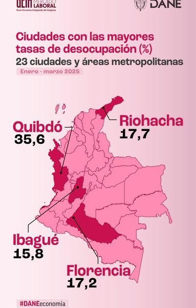 Las ciudades que presentaron mayores tasas de desocupación para este periodo fueron: Quibdó (35,6%) con una diferencia de 5,9 p.p. respecto al mismo periodo del 2024 (29,7%), seguido de Riohacha (17,7%) y Florencia (17,2%). En contraste, las ciudades que mostraron menores tasas de desocupación fueron: Medellín A.M. (7,9%), Villavicencio (9,0%) y Neiva (9,5%).