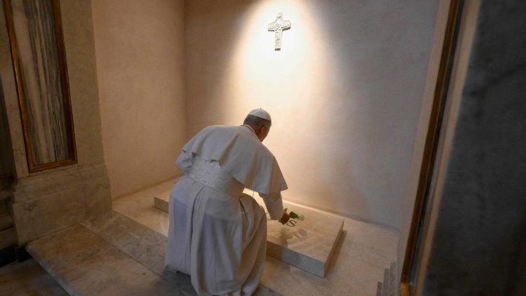 –(Foto Vatican News). El papa León XIV acudió este sábado a rezar ante la tumba de Francisco, su antecesor, poco después de visitar por sorpresa el santuario agustino de la Virgen del Buen Consejo en Genazzano, en las afueras de Roma, en su primera salida desde que fue elegido tras dos días de cónclave.
