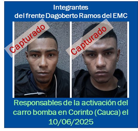 –El Mayor general Carlos Fernando Triana Beltrán, director de la Policía Nacional, confirmó la captura de dos sujetos señalados como presuntos responsables de haber ubicado y detonado el carro-bomba en el centro del municipio de Corinto, Cauca, en desarrollo de la oleada terrorista desatada por las disidencias de las Farc de alias Iván Mordisco.