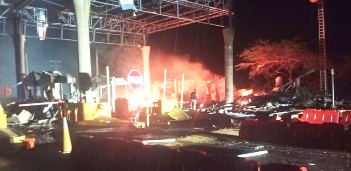 –(Foto red social). Una cajera y un vigilante resultaron muertos en un ataque con explosivos perpetrado a las 2 de la madrugada de este viernes contra el peaje de Alto Pino en la carretera entre Maicao y Riohacha, la capital de La Guajira y el cual se atribuye en principio al Eln por una bandera roja y negra con sus siglas que se encontró en el lugar.
