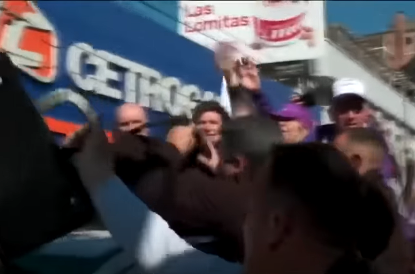 El presidente circulaba en la caja de una camioneta y saludaba a sus seguidores durante una caravana de campaña en Lomas de Zamora, 20 km al sur de Buenos Aires, cuando manifestantes que se oponían a su presencia comenzaron a arrojar plantas de los canteros, piedras y botellas hacia el coche presidencial.
