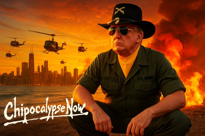«Me encanta el olor de las deportaciones por la mañana…», escribió el mandatario en su cuenta de Truth Social. «Chicago a punto de descubrir por qué se llama Departamento de GUERRA», concluyó, junto a una fotografía suya generada por inteligencia artificial con el título ‘Chipocalypse Now’, una clara parodia a la emblemática película ‘Apocalypse Now’.