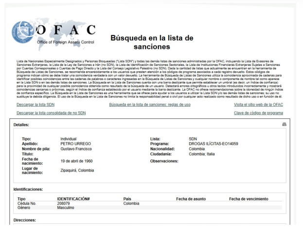 “Desde que el presidente Gustavo Petro llegó al poder, la producción de cocaína en Colombia se ha disparado a su nivel más alto en décadas, inundando Estados Unidos y envenenando a los estadounidenses”, manifestó el secretario del Tesoro, Scott Bessent.La lista es emitida por la Oficina de Control de Bienes Extranjeros (Office of Foreign Assets Control (OFAC) del Departamento del Tesoro de los Estados Unidos y fue creada en octubre de 1995, por la Orden Ejecutiva 12978, emitida por el presidente Bill Clinton como parte de una serie de medidas en la guerra contra las drogas y el lavado de activos.