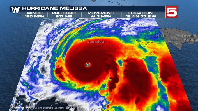 –(Imagen @WeatherNation). El huracán Melissa, formado como tormenta tropical el martes pasado en el mar Caribe, ha alcanzado la categoría 5, según el Centro Nacional de Huracanes (NHC, en inglés) de Estados Unidos, que prevé vientos destructivos, marejada ciclónica e inundaciones catastróficas que empeorarán en Jamaica durante el día y hasta la noche de este lunes.