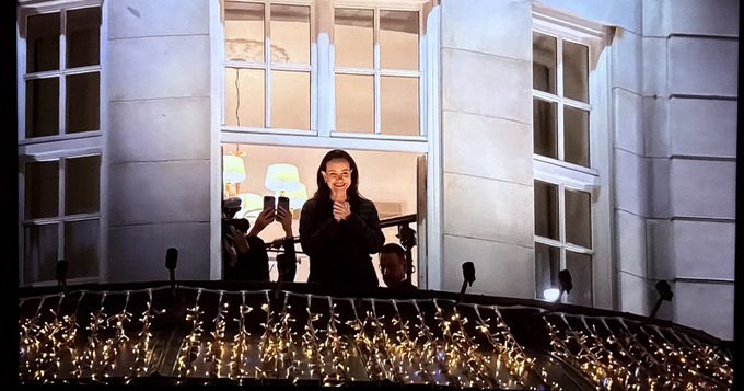 Machado salió al balcón del Grand Hotel de Oslo, ya de madrugada visiblemente cansada pero sonriente, a saludar a sus seguidores y cantó el himno de su país con la mano en el pecho.