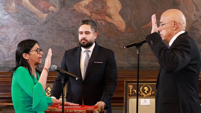 La funcionaria prestó su juramento ante el presidente de la Asamblea Nacional, Jorge Rodríguez, ante quien dijo sentir dolor por el secuestro de Maduro y su esposa, Cilia Flores.