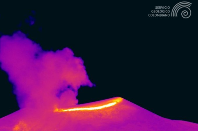 Figura 1. Registro de la cámara térmica MinaIR, ubicada 2,2 km al norte del volcán Puracé en la que se observa una emisión de ceniza registrada el 8 de enero de 2026 a las 2:11 a. m. (hora local) Con base en lo anteriormente expuesto, desde el SGC recomendamos no acercarse a los cráteres de los volcanes Puracé, Piocollo y Curiquinga, así como a sus alrededores. Sugerimos seguir atentamente la evolución del proceso actual por medio de los boletines extraordinarios y la información publicada en nuestros canales oficiales, así como las instrucciones de las autoridades locales y departamentales, y de la Unidad Nacional para la Gestión del Riesgo de Desastres (UNGRD)