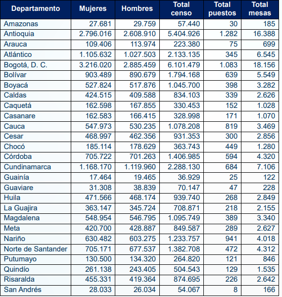 En Colombia, 40.036.238 ciudadanos (20.553.062 mujeres y 19.483.176 hombres) podrán sufragar en 123.314 mesas de votación, que se instalarán en 13.493 puestos: 6.011 en el área urbana y 7.482 en el área rural.