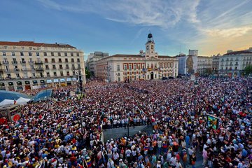 Miles de venezolanos llenaron la Puerta del Sol de Madrid para ver por primera vez en muchos años a Machado, que abandonó Venezuela en diciembre para recibir el Nobel de la Paz en Oslo tras pasar más de una década sin salir del país.